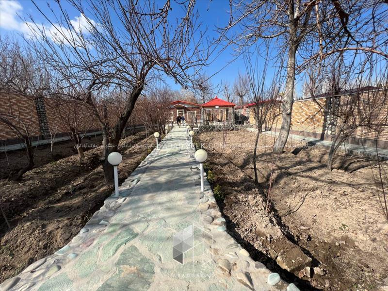 910 متر باغ با انواع درختان میوه مثمر 90 متر ویلا ، یک خوابه انشعابات آب ، برق و گاز قانونی آلاچیق و استخرشنا سهمیه آب کشاورزی جهت آبیاری درختان واگذاری ملک به صورت قولنامه و وکالت از سند مادر
