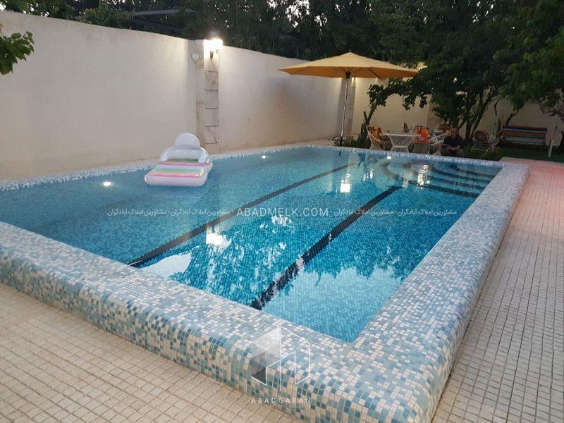 استخرشنای کاشی کاری شده به همرا تصفیه خانه و نور پردازی کامل داخل استخر با طیف رنگی ژورنالی در محوطه باغ ویلا جایگذاری شده است .