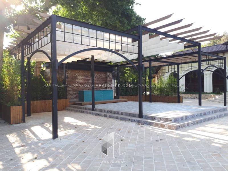 در محوطهی باغ، درختان مثمر قدیمی، چمنکاری، گلکاری رنگارنگ، آلاچیق بزرگ، استخر مجهز به تصفیهخانه و سیستم گرمایش آب، مسیر سنگفرششده و نورپردازی حرفهای شبانه، فضایی آرام و رویایی برای استراحت و دورهمیهای خانوادگی ایجاد کرده است.