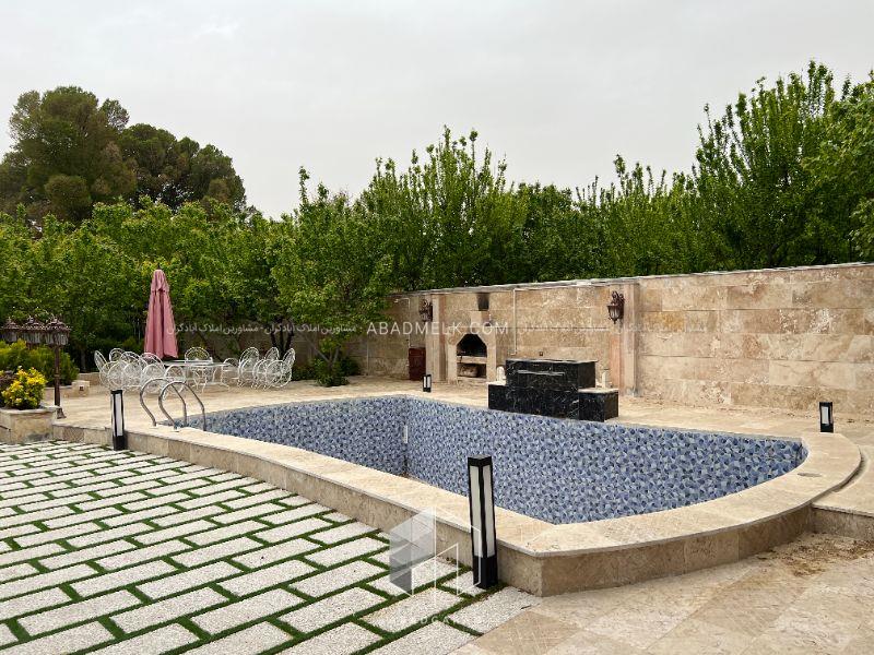 استخر شنا کاشی کاری شده همراه با تصفیه خانه در بهترین موقعیت باغ و در جلوی ویلا جایگذاری شده است .