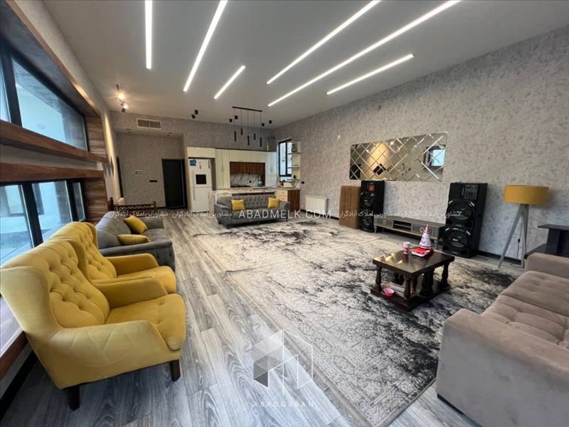 سالن این ویلا 130 متری به شکل زیبایی نورپردازی شده است و جهت کف پوش ویلا از پارکت استفاده شده است .