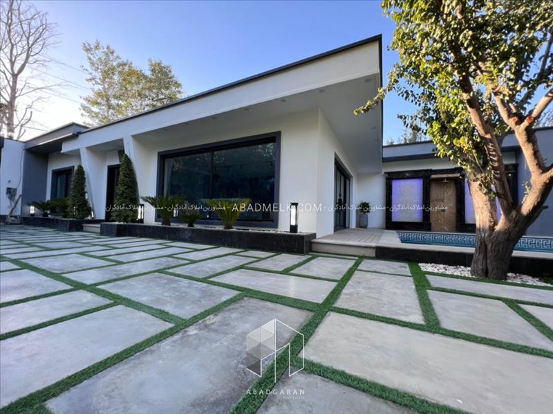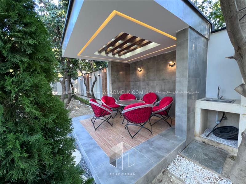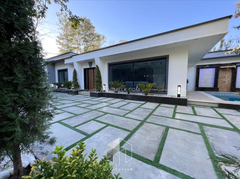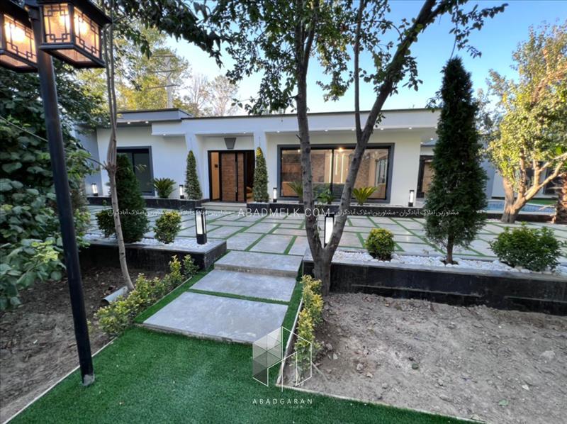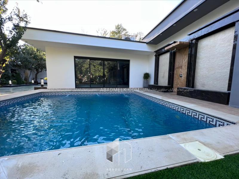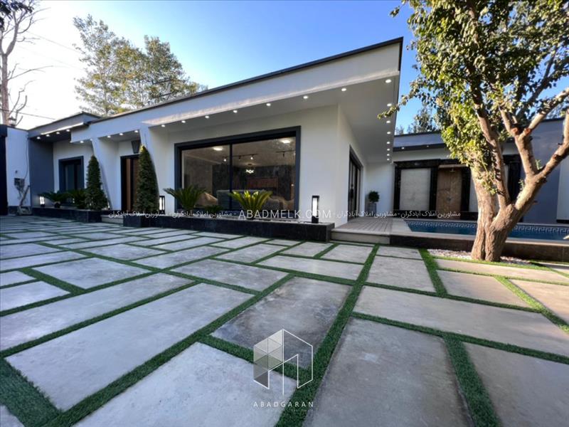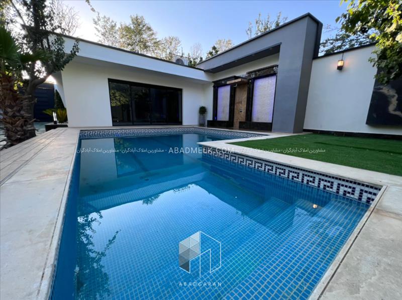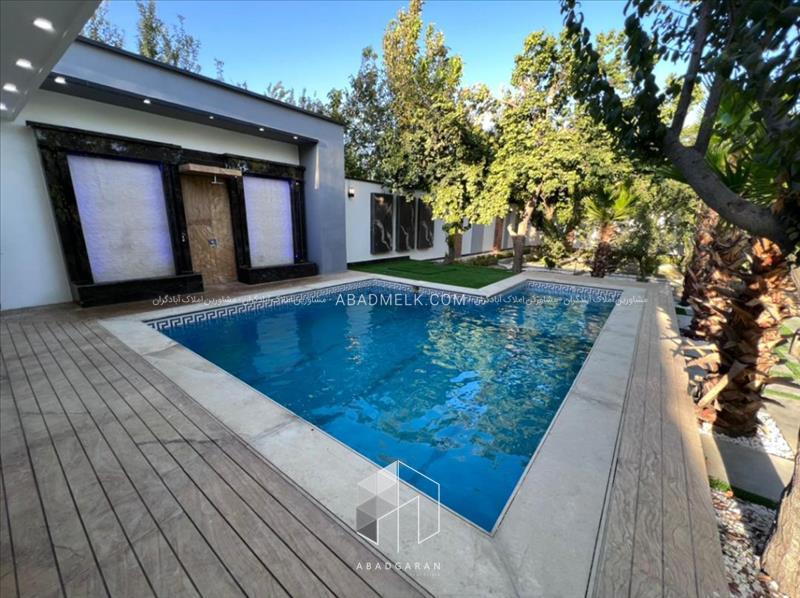 فروش باغ ویلا در ملارد به سبک معماری مدرن با محوطه سازی کاملا اصولی با امکانات بکار رفته ای چون استخر شنا کاشی کاری شده به همراه تصفیه خانه در مجاورت ویلا ، باربیکیو و آلاچیق و کف پوش تلفیقی محوطه باغ ویلا با استفاده از واش بتن و چمن .