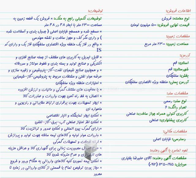 * فروش یک قطعه زمین به مساحت 2300 متر با ابعاد 48 در 48 متر * مسطح شده و همسطح خیابان اصلی ( جدول بندی و آسفالت شده ) و داری مگر کف و مجوز ساخت و نقشه مهندسی * واقع در فاز یک منطقه ویژه اقتصادی سلفچگان فاز یک و دارای کد IS * قابل تبدیل به کاربری های مختلف از جمله صنایع فلزی و الکتریکی و صنایع تولید و بسته بندی و خطوط مونتاژ و سردخانه * و همچنین صنایع شیمیای نفت-گاز-پتروشیمی و ذخیره سازی و عرضه مواد نفتی و مشتقات مربوط به پتروشیمی-گاز-شیمیایی * امتیازات منطقه ویژه سلفچگان * با معافیت های مختلف گمرکی و مالیات و ارزش افزوده * اتصال به خط راه آهن جهت واردات و صادرات کالا * ایجاد تسهیلات جهت برقراری ارتباط مخابراتی و رادیویی و ماهواره ای * امکان ایجاد نمایشگاه و انبار اختصاصی * امکان اخذ امتیاز صنعتی آب-برق-گاز-تلفن *دارای گمرک بین المللی و امکان صدور و ترانزیت کالا * واردات مواد اولیه و کالاهای نیمه ساخته جهت تولید و پردازش * ارائه خدمات و تسهیلات گمرکی * عدم اعمال محدودیت زمانی برای نگهداری کالا و حداقل هزینه های انبارداری و عدم متروکه شدن کالا * امکان بیمه نمودن کلیه کالاهای وارداتی به هنگام ورود و خروج * مجاز بودن ترخیص تمام یا قسمتی از کالای وارداتی در زمان نا محدود