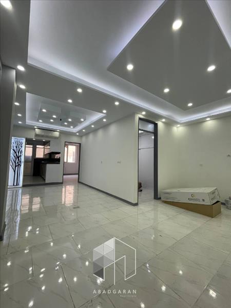 متراژ ۶۸ دو خواب تخت خور خوش نقشه طبقه پنجم کمد دیواری پارکینگ سندی کابینت هایگلاس پکیج رادیاتور کولر گازی گاز رو میزی و هود لوستر کناف و نورپردازی انباری سندی