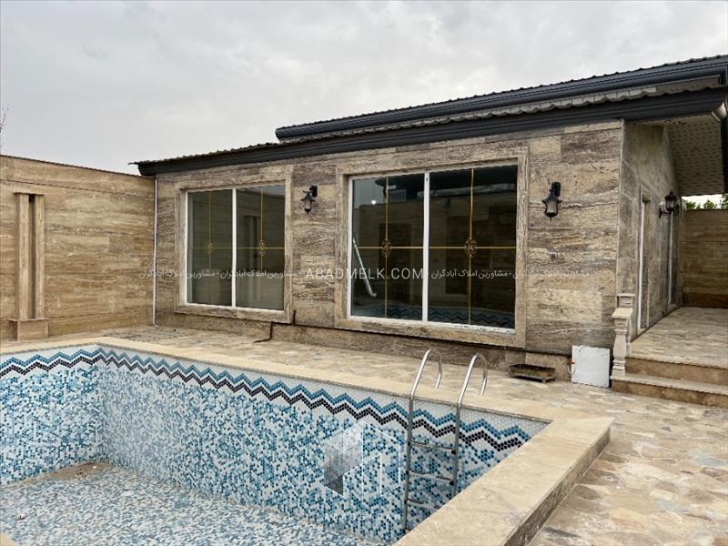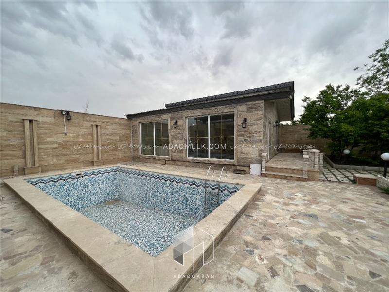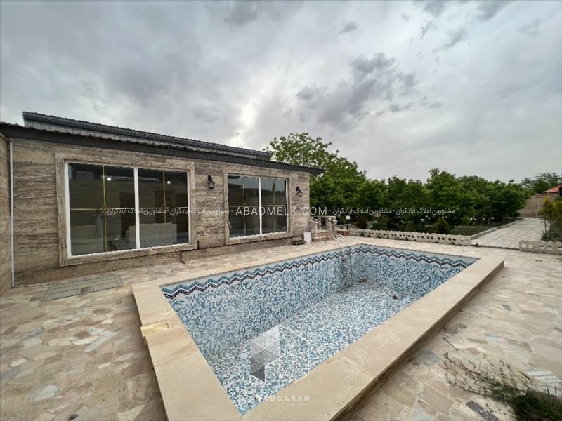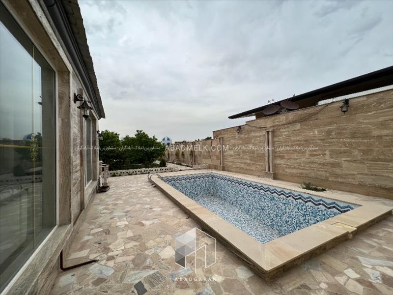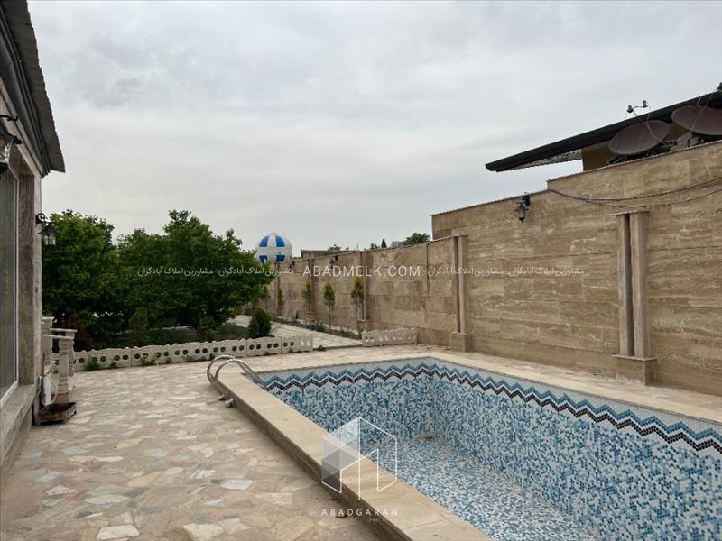 استفاده از انواع درختان مثمر و تزئینی ، استخر شنا کاری شده به همراه تصفیه خانه و نورپردازی در محوطه این باغ ویلا 750 متری در مهرچین ملارد .