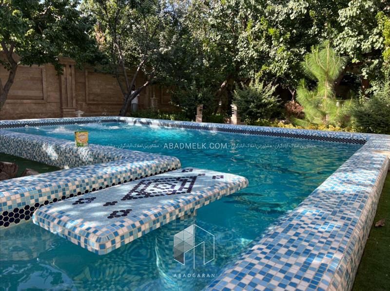 استخر شنا بصورت چهارفصل و کاشی کاری شده به همراه تصفیه خانه در بهترین لوکیشن باغ جایگذاری شده است .