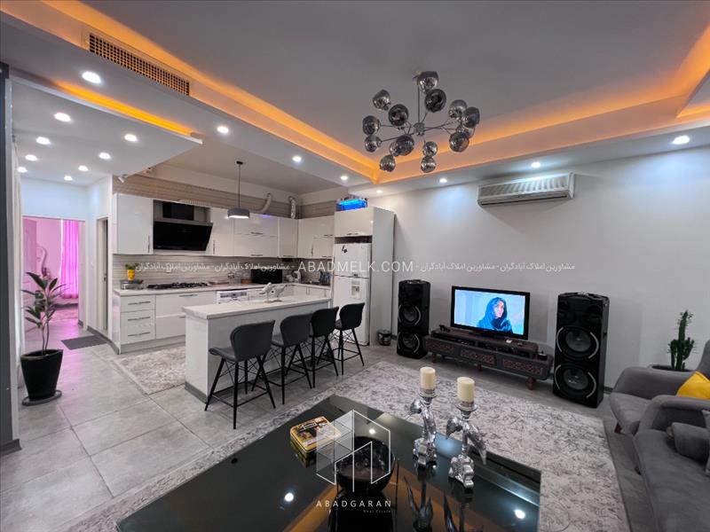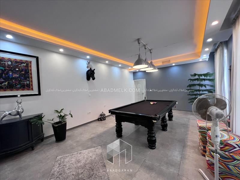 فضای داخلی سالن این ویلا 100 متری بصورت خیره کننده ای نورپردازی شده است که در کنار کنافکاری سبب جلوه بیشتر در سالن ویلا شده است .
