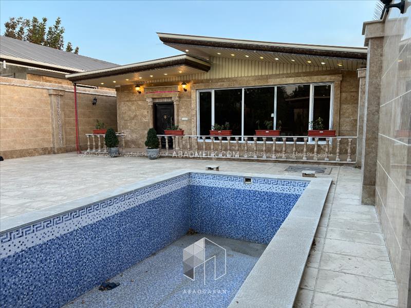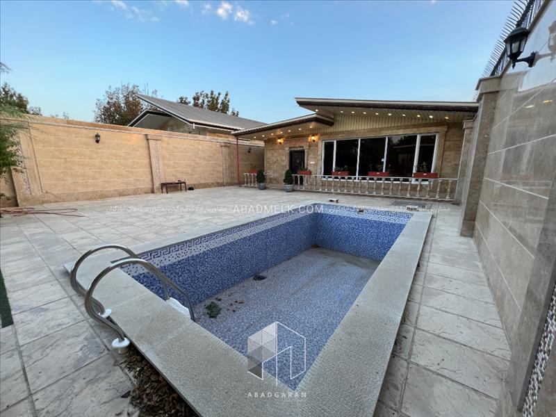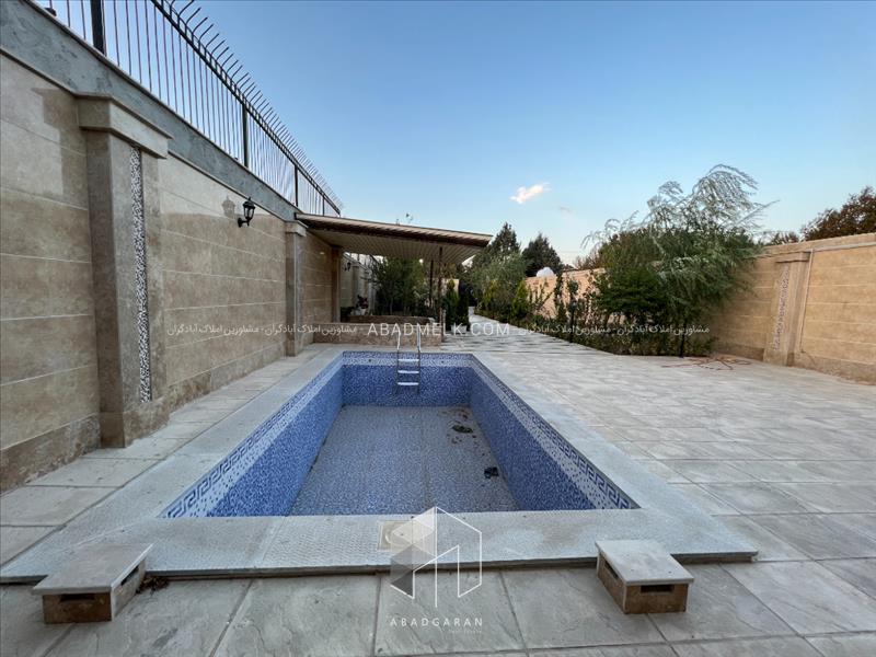استخر شنا کاشی کاری شده به همراه تصفیه خانه در روبروی ویلا در محوطه باغ جایگذاری شده است .